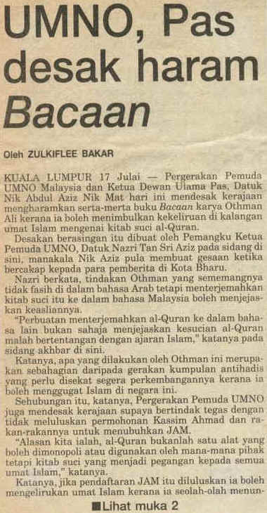 Tokoh politik tersebut menyatakan lagi bahawa perbuatan menterjemahkan al-Qur'an adalah bertentangan dengan ajaran Islam!
