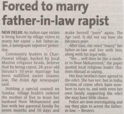 Ketua-ketua masyrakat di kampung Charthawal, disokong oleh kepala-kepala agama Islam tempatan, percaya bahawa dengan rogol itu maka perkahwinan Imrana, 28 tahun, yang telah berlangsung selama 10 tahun, jadi batal di bawah undang-undang Islam, kata akhbar The Asian Age.